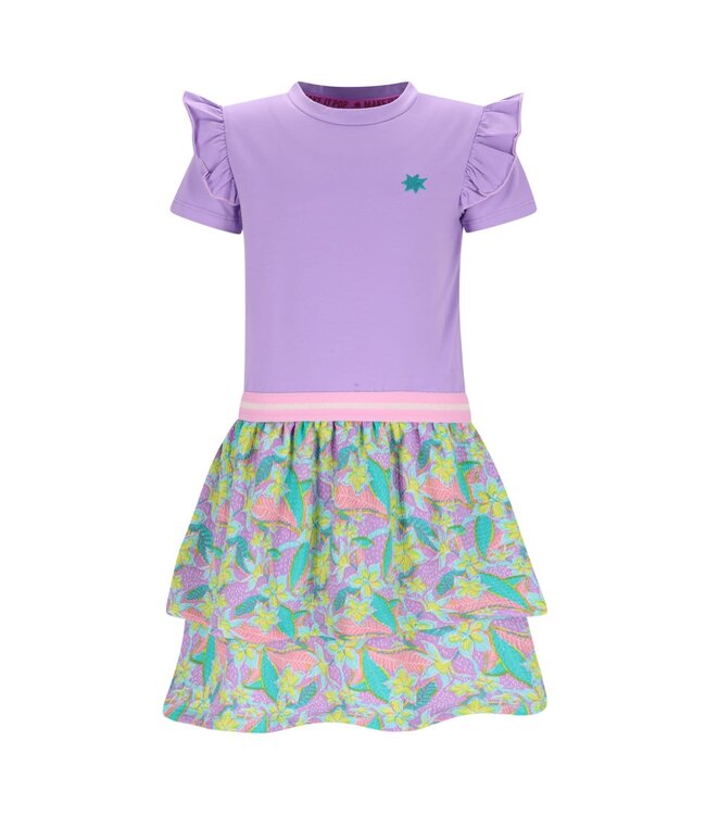 Fleurig en zwierig kleedje met prachtige multi color laagjes rok. Mooie lila bovenkant.